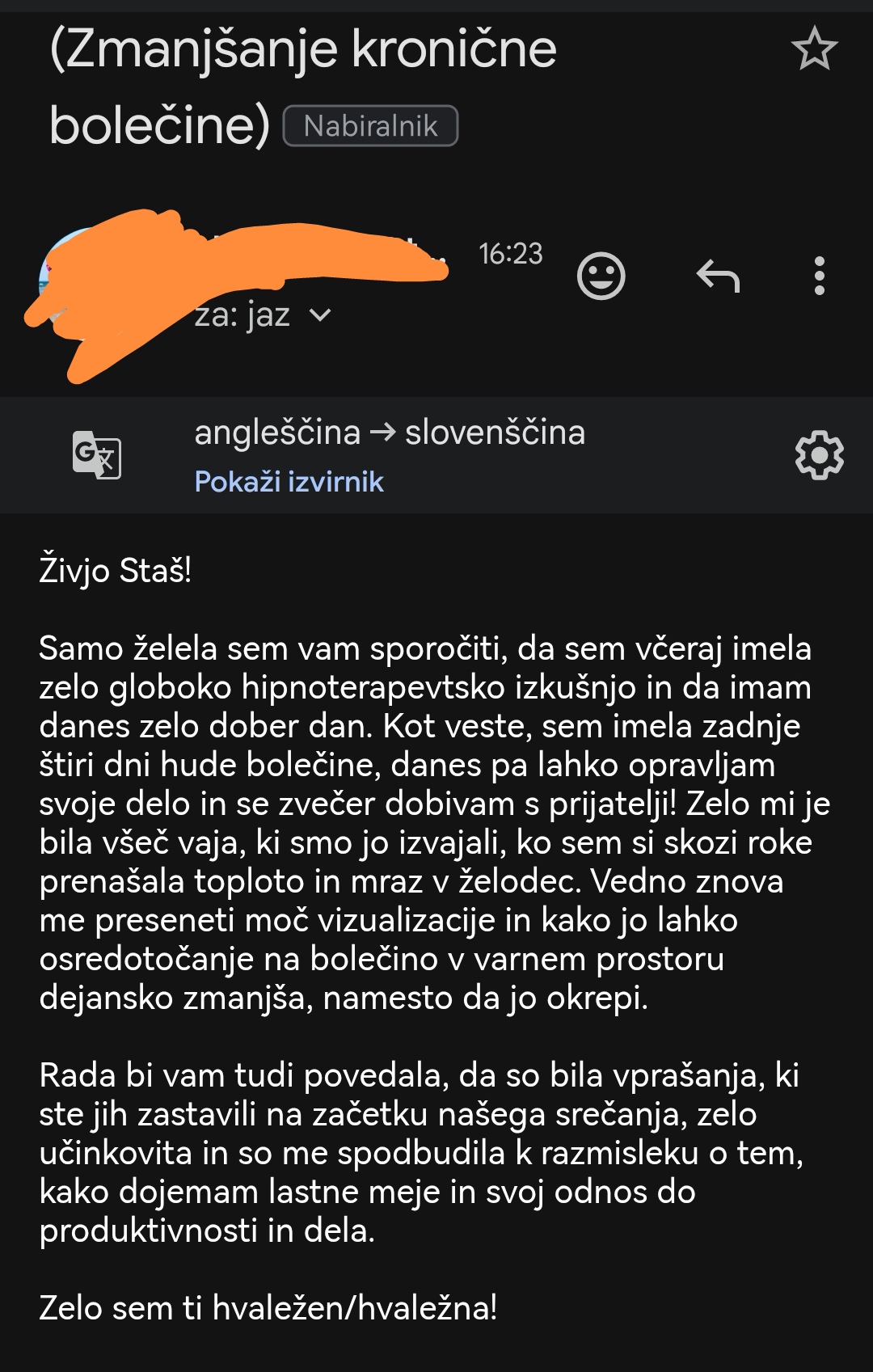 Ta vrsta bolečine je pogosto kronična, dolgotrajna bolečina, ki nima več zaščitne ali opozorilne funkcije, ampak zgolj vzdržuje trpljenje. Bolečina, ki je izgubila svojo prvotno funkcijo opozarjanja in nima več pomembnega sporočila za nas, je tista, ki jo lahko uspešno obravnavamo s hipnozo.